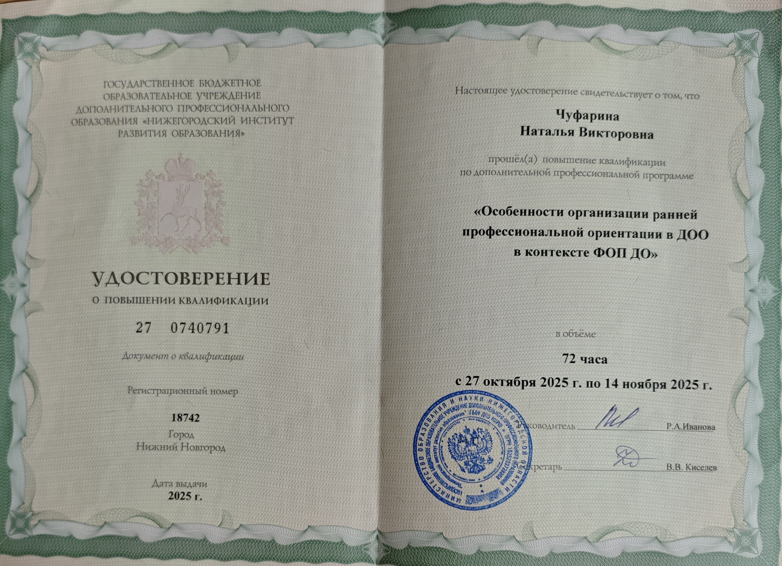 (ГБОУ ДПО "Нижегородский институт развития образования". 72часов. Направленность: иное).
